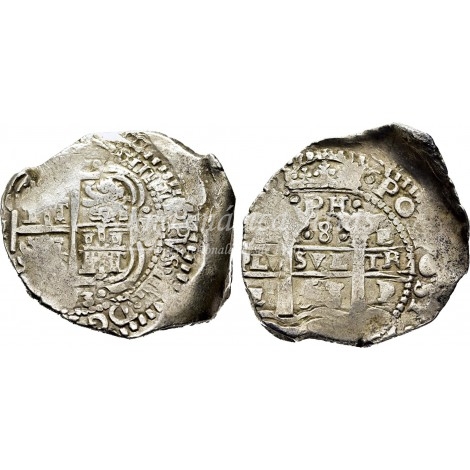 Moneda macuquina de real de a 8 de Felipe IV. Potosí. Ensayador: E.